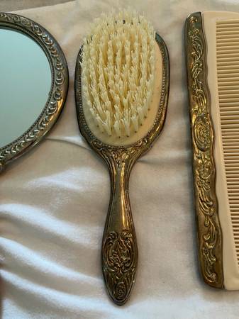 Up for sale is a vintage, silver plated bathroom vanity three piece set - Mirror, Brush, and Comb. All items seem to be in good condition. The mirror glass does have a couple imperfections (see pictures). They are a little tarnished, and could probably use appropriate cleaning. Please see pictures for details, and message me with any questions. Can meet in Weaverville, Mars Hill, etc.