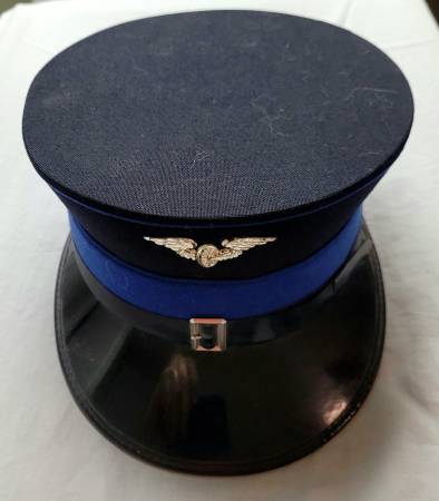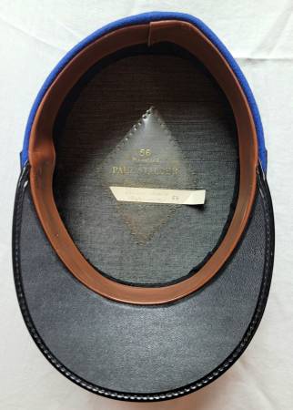 Swiss conductor's cap, most closely matches the "Rhatische Bahn" style - black with blue felt band, silver buckle and silver "flying wheel" medallion. Inside imprinted - "56 / Mutzenfabrik / Paul Stalder / Bern." Handwritten insert - "Blum Adolf Bahnwaiter, 56." Appears to have some very light wear. $25.