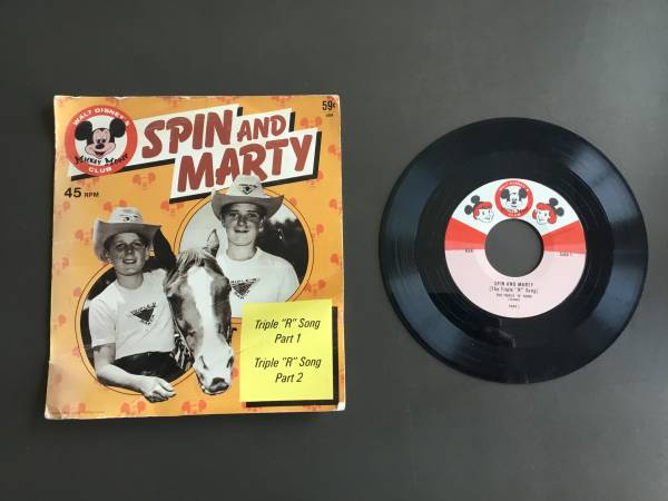 Mousekedances, Mickey Mouse Alma Mater and Spin and Marty. Cardboard cases have some bend marks, but 45s are unscratched and in excellent condition. See photos.