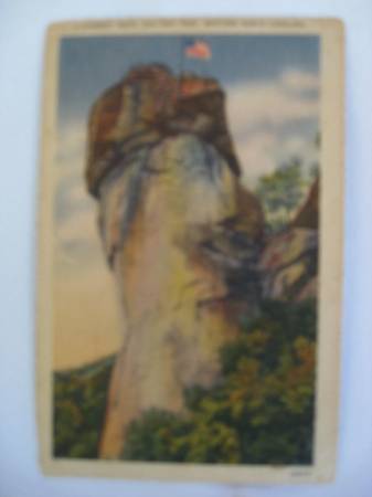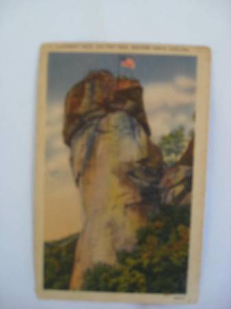 Postcard depicting a sketch of Chimney Rock # 41973. It is stamped 1955 and is signed Mrs. Nelson to Mrs. Marie Maine, who appears to have moved to Brownsville, TX. The stamp has been removed....