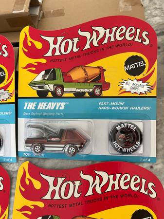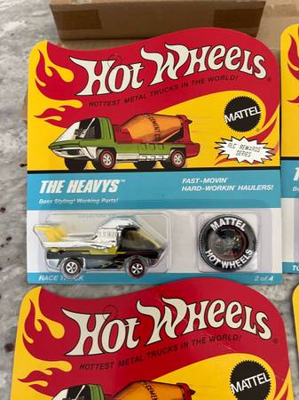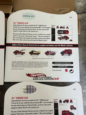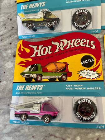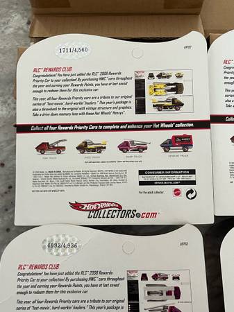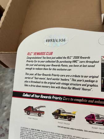 Up for sale is a complete set of HotWheels Rewards Cars "The Heavys" from the 2008 Redline Club. Included is the Race Truck - number 1711 of 4560 - the Tow Truck - number 480 of 4436 - the Ramp Truck - number 4093 of 4936 - and the Vending Truck - number 1060 of 5904.. They are all in original packaging, having only been removed for pictures. However, the Ramp Truck has a crease on the top right corner from having the cardboard protector creased. Please see pictures for details, and message me with any questions. Can meet in Weaverville, Mars Hill, etc.