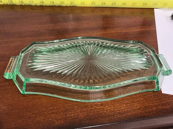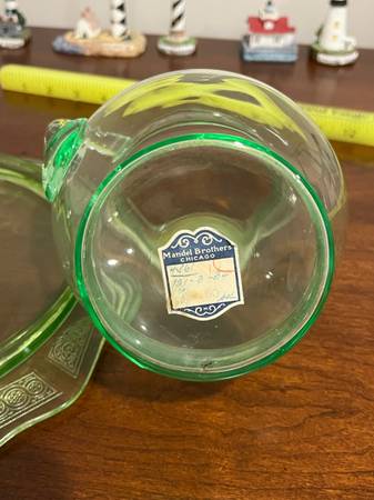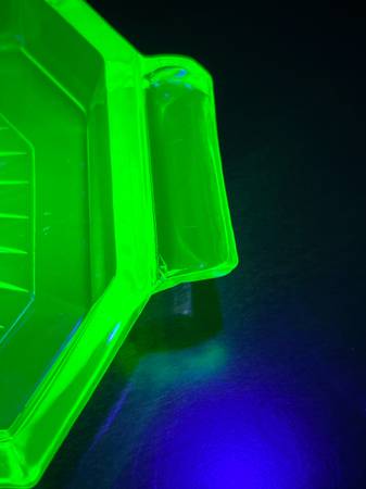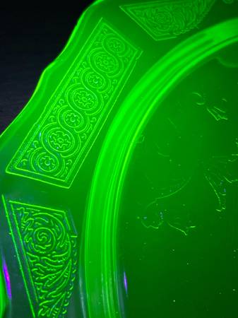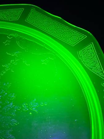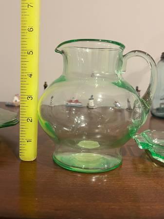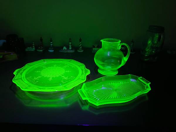 Up for sale are three pieces of uranium glass: a plate, pitcher, and tray. They could use some cleaning, but in good shape. Under the black light, I did see a couple light scratches on the plate, and one small crack in one handle of the tray. Please see pictures for details, and message me with any questions. Can meet in Weaverville, Mars Hill, etc.