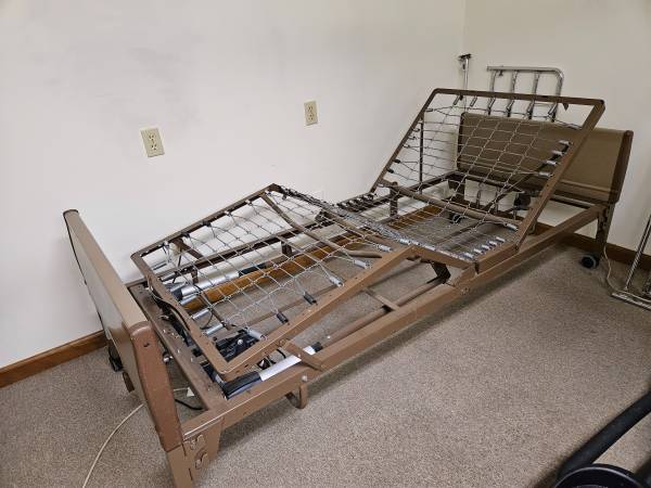 Adjustable bed with hand held remote control. Control module allows separate control of backrest, legs, and bed height. Bed also has rollers on the legs that can be locked to provide a more stable platform. Bed includes chrome detachable side rails that can be raised or lowered. Cash only.