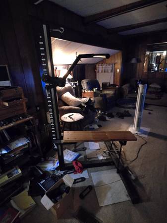 Wooden bench, many weight bands, bands are still available. Call anytime. Special attachment for bench press! Call anytime-you move it!