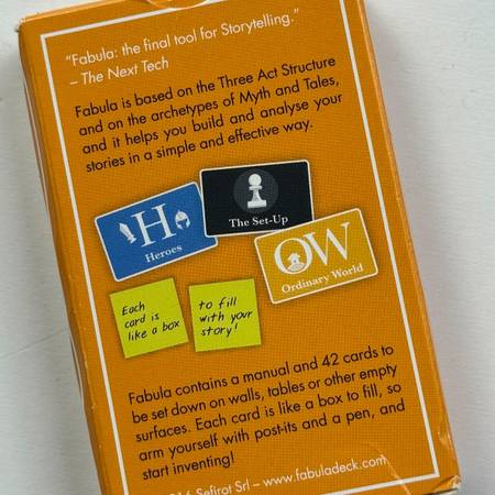 The Fabula deck is published by Sephirot in Italy. I have 3 complete decks for sale, two are unopened. The cards in the open deck are pristine but the box is a little worn. This is an amazing tool that can be used in a variety of ways. It works well with the classic fiction framework of The Hero's Journey. A tool to stimulate creativity and help the writer consider all angles of their work. I'll sell all 3 decks for $40. I also have two unopened decks of a public speaking framework card deck called Cicero, also published by Sephirot. I'll sell all five decks for $50. Each of these decks ordinarily sells for $35 each. They are clever, inspiring, and help the creative person build confidence. Find out more at www.fabuladeck.com